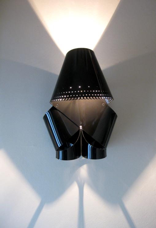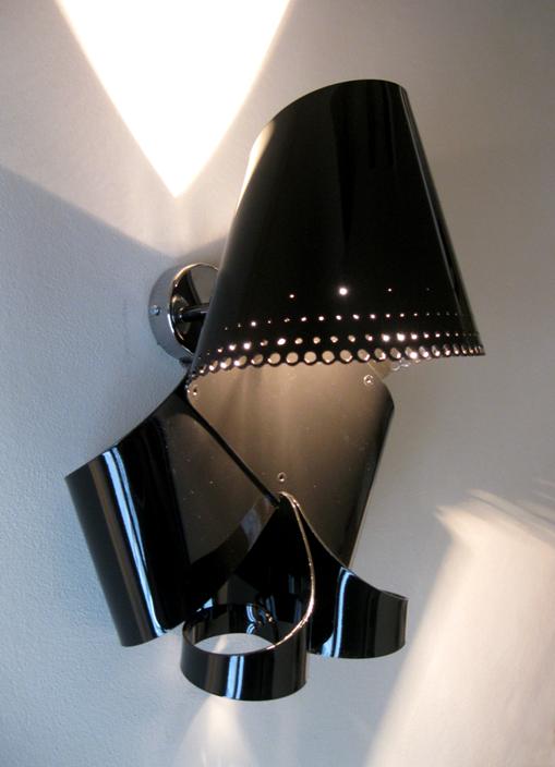 Wall sconce providing diffused lighting. Diffuser strips of nylon with nylon colored in BLACK. Chromed steel wall fitting.